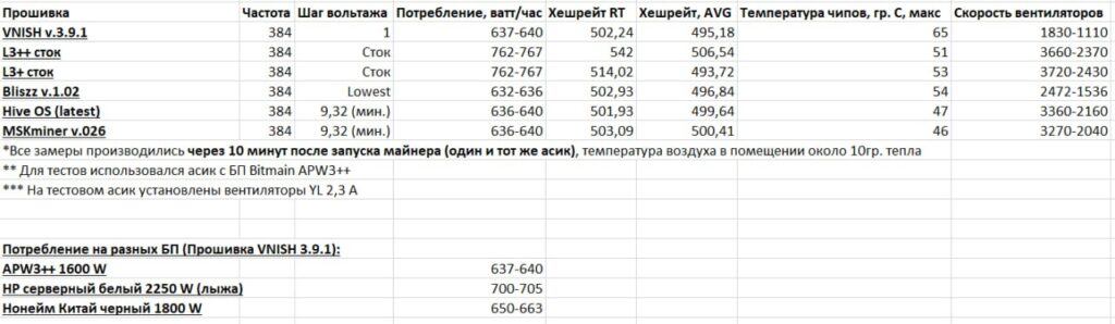 Таблица энергопотребления и температур на разных прошивках и блоках питания