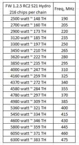Однозначного ответа на данный вопрос нет, так как всегда разгонный потенциал Whatsminer упирается в блок питания. Пиковая мощность блока питания для устройств 30/50 серии 3800w. Для простоты примерных расчетов можно взять такую формулу: 3800: энергоэффективность асика. Например: M30S+ 104 th 32w/th. 3800:32= 118 th. Но не забываем, что 3800w это пиковая мощность блока питания, долговременная работа асика с потреблением в 3800w может привести к поломке блока питания. Для постоянной работы берем значение 3600-3650w: 3600:32=112.5 th.