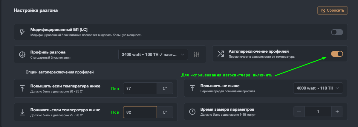 Как правильно настроить автопереключение профилей разгона на прошивке 7Miners Vnish?